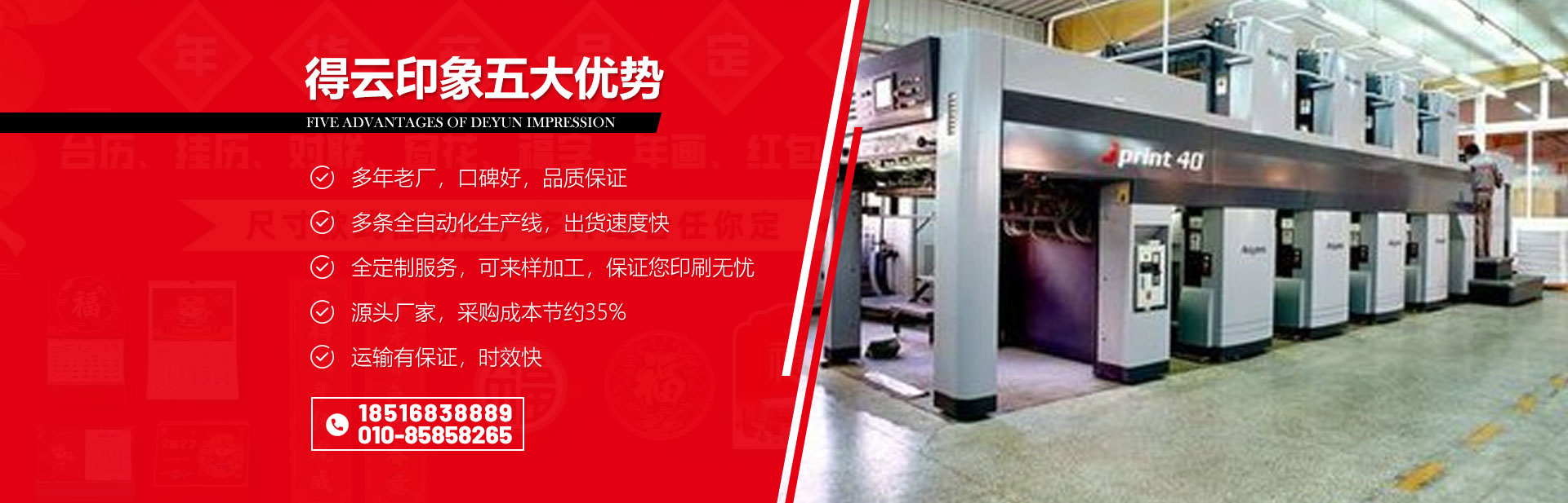 北京得云印刷集设计、印刷、后期加工为一体,经过多年来的艰苦奋斗,目前已拥有全新佳能6000,施乐彩色机,惠普高速打印机,EPSON宽幅彩色打样机,德国海德堡GT052-4八开四色印刷机,德国曼罗兰700对开四色印刷机,德国海德堡对开彩色6+1印刷机,德国罗兰全开四色印刷机,日本利优比四开四色印刷机,曼罗兰单色08胶印机,曼罗兰单色47胶印机,台湾大升商标等印刷机及数台骑钉龙、胶订龙,精装龙,全自动覆膜机,全自动折页机、全自动模切机、纸箱对裱机,精品盒开槽机,激光雕刻机,烫金机等印后加工设备,具备后期一条龙服务能力。公司专业印刷各类高中档书刊,画册,期刊,彩色包装盒,精品盒,纸箱药盒,封套彩页,台历挂历,无碳复写,手提袋,无纺布袋,PCV袋,塑料袋,广告海报,信纸信封,档案袋,不干胶商标,PVC商标等精美印刷。并承诺以快捷的速度和合理的价格服务新老客户。